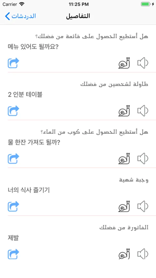كل كلمة وكل جملة مكتوبة في اللغة الكورية وأيضاً مكتوبة في اللغة العربية بحيث تساعد المستخدم في معرفة كيفية نطق الكلمة أو الجملة