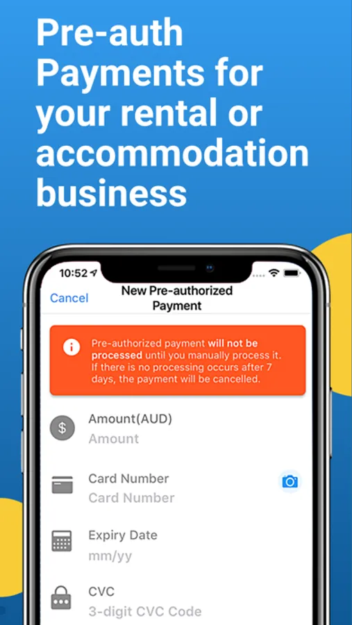 - Pre-authorized payments: Process pre-auth payments which will automatically be cancelled after 7 days if not manually processed or cancelled prior. Perfect for car rentals and accommodation providers.