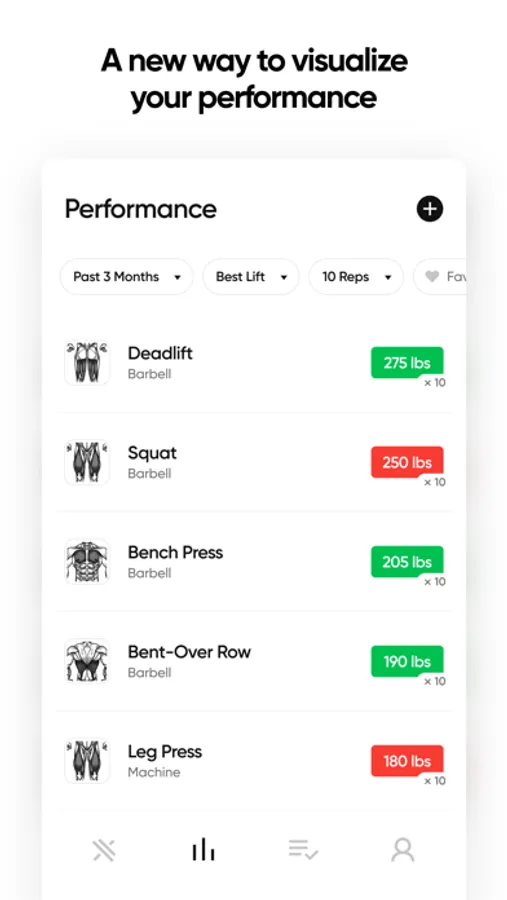 • On our Performance tab, you can view all of your exercises and identify which exercises need improvement (red) and which exercises you’ve been improving (green). Robust filtering allows you to filter your exercises by muscle group, equipment type, rep count, favorites and more.
