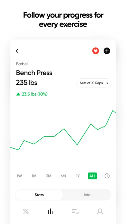 • If you tap an exercise from the Performance tab, the “Exercise Stats” page for that exercise will open. Visualize your progress over time with powerful charts and exercise data. Our charts are fully custom and incredibly intuitive. We also provide quick stats for every exercise, like your average lift, lowest lift, most frequent lift, average rep count, average sets performed and more.
