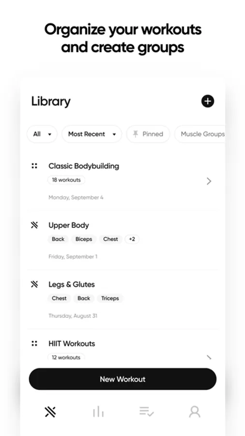 • Create groups to organize your workouts. For example, you can create a group to represent your current training routine – if you’re doing a "5 Day Split" training routine, create a workout group, title it “5 Day Split” and add in your workouts. You can “pin” your favorite workouts to the top of your Library for easy access.