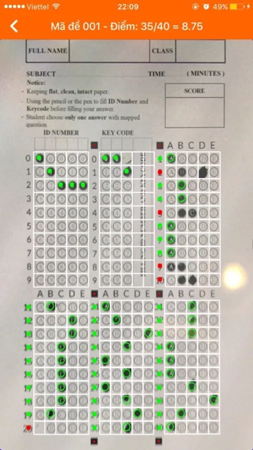 - Scan: Use to scan your answer, you should move the camera to the 4 corners of the answer sheets, the red square will blink.The application will detect 4 corners and find the correct answer, the correct answer will be green , the incorrect answer will be red.