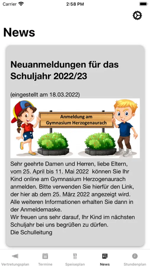 Mit dieser App können Schüler und Schülerinnen des Gymnasium Herzogenaurach die News der Webseite, den Vertretungsplan, Speiseplan der Mensa und allgemeine Termine einsehen.