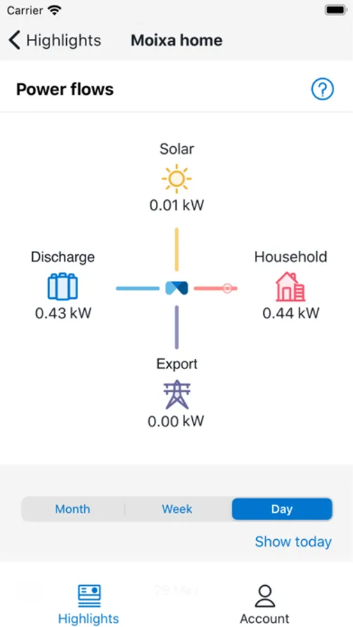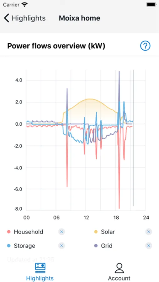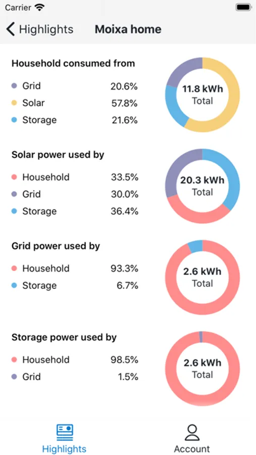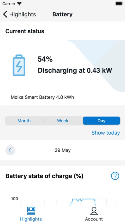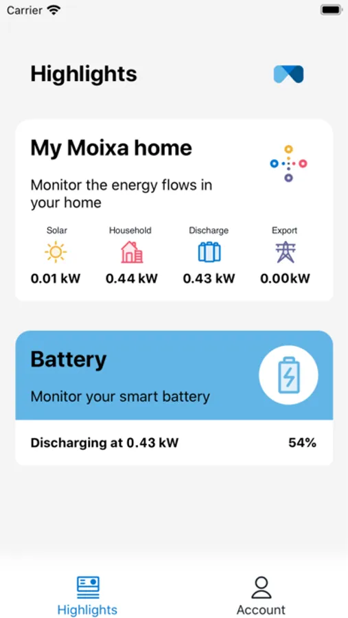 - view the status of your Moixa-connected home and battery on the Highlights tab