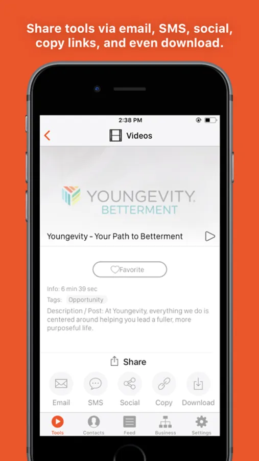 Media: It has never been easier to share information about your products and opportunity via SMS text, email, or social media. Simply choose from the library of content and digital tools specifically designed to promote your business and share them with a contact. You'll even receive a notification when they view the tools so you know exactly when to follow up! No data connection? No problem! Simply download content in the app beforehand for offline playback.