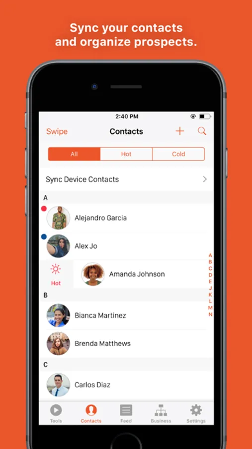 People: Manage contacts easily and swipe to sort them by interest level. You can make connections, add notes, or check out the Contact Feed to see the tools you've shared and whether or not your contacts have actually viewed them.