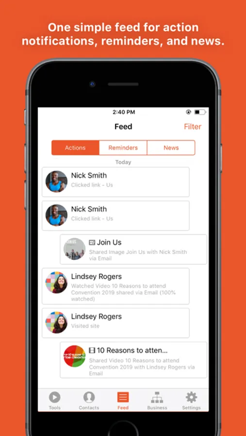 Feed: Keep track of everything you’ve shared and see what your contacts have viewed with notifications. You can even swipe notifications to mark them as a Reminder. News also brings all of the latest announcements and social posts from corporate straight to you--in one convenient place!