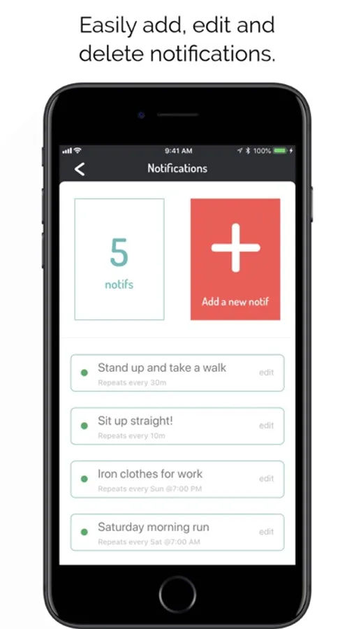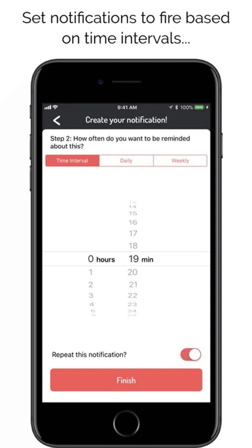 * The ability to have repeating or non-repeating notifications that fire based on a set time interval (Ex: Every 5 minutes or every 5 hours)