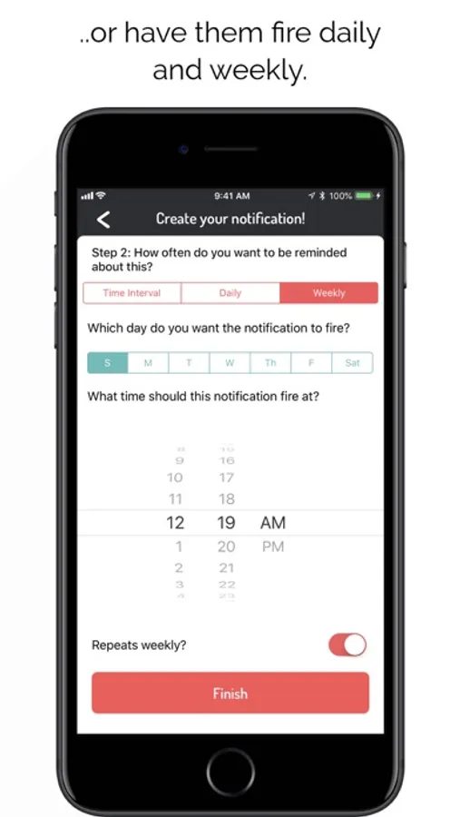 * The ability to have repeating or non-repeating notifications that fire on a specific day of the week at a specified time (Ex: Every Monday at 3 PM)