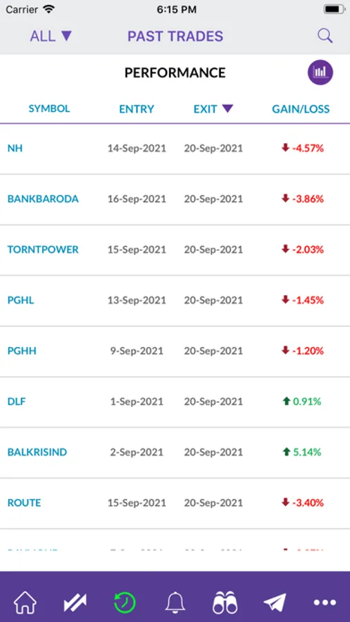 Once a trade is closed by a stock reaching the profit goal, flashing a sell signal or hitting the stop loss, the stock moves to the past trades section. You get a snapshot of each closed trade and this list is easy to sort and search.