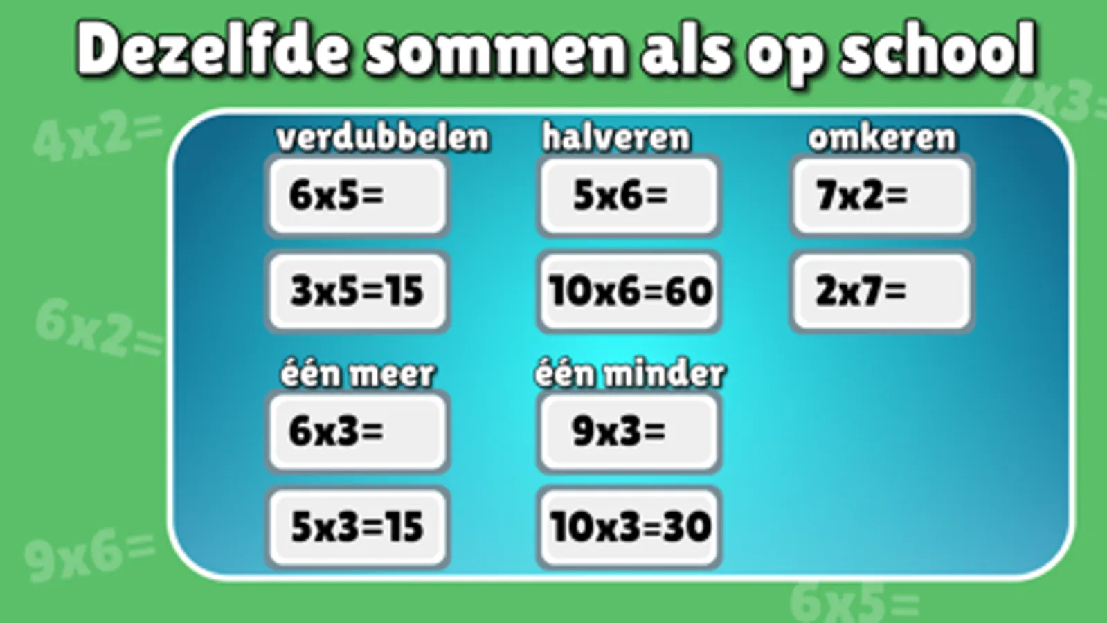 * Herhaald optellen (2+2+2=6 is hetzelfde als 3x2=6)