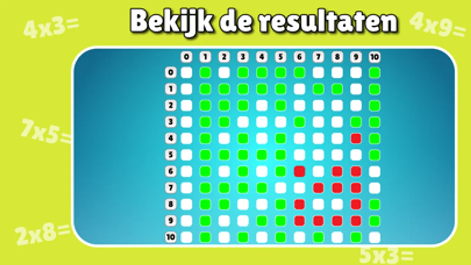 * Toets je kind met de app en bekijk bij de resultaten welke sommen nog geoefend moeten worden.