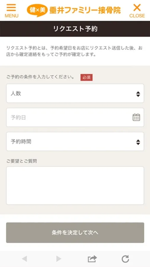 希望の人数・日時を指定して送信するだけで予約を依頼できます。