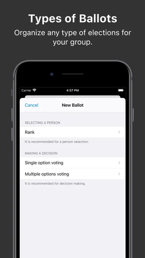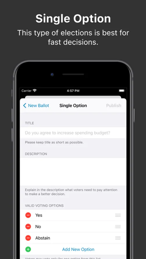 Single Choice Voting - This type of elections is best for fast decisions (Yes/No/Abstain) and when your voters are almost equally informed about decisions that they need to make.