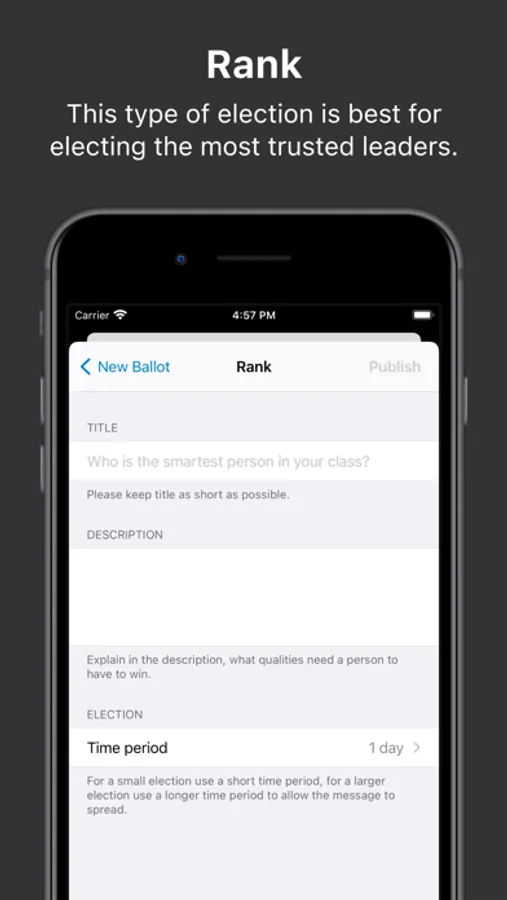 Open Voting - This type of election is best for electing the most trusted leaders. There are no candidates per se, like in other kinds of elections. All voters may vote for each other. In the end, we calculate the voting graph, and the person with the most trusted rank becomes the winner.