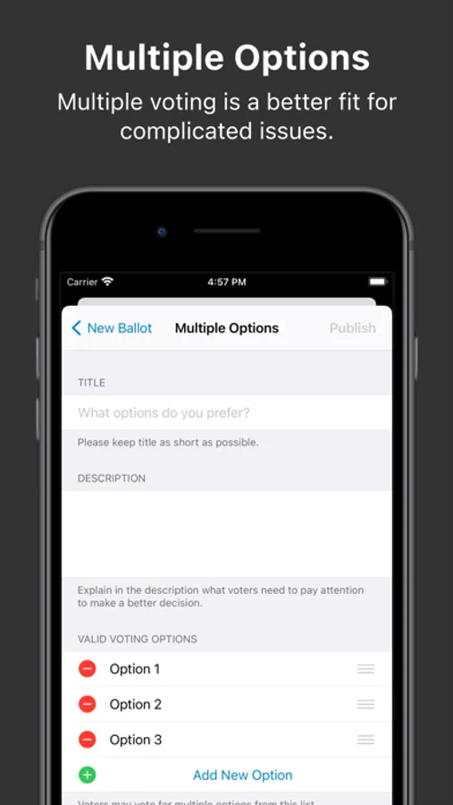 Multiple Choice Voting - Multiple voting is a better fit for complicated issues where voters need to have more options. We recommend this type of ballot when the voters choices are multiple and the options are not mutually exclusive.