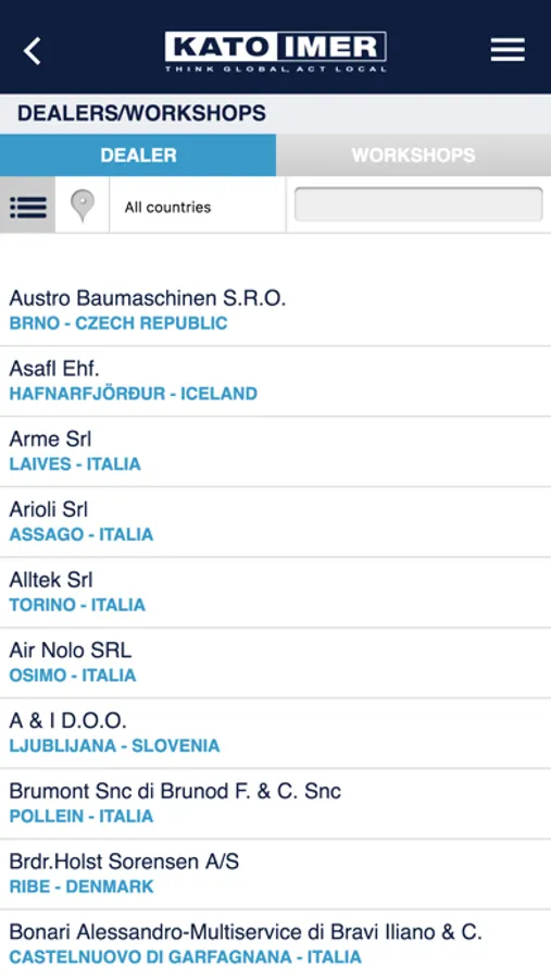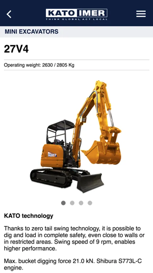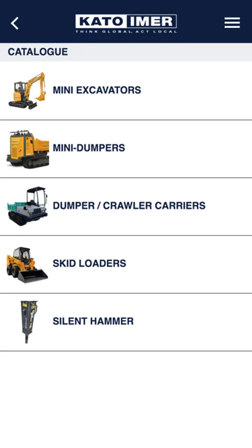 With the new KATO IMER app you can consult the entire product catalogue and download the related brochures and manuals. In the app you will find the complete list of dealers and workshops and their location on the map. You can also receive notifications on important updates published by the company, consult the FAQ and contact KATO IMER directly. Lastly, the reserved area allows you to register your machines and download the related documents (Technical Data Sheet and Brochure) and request the Operating Manual.