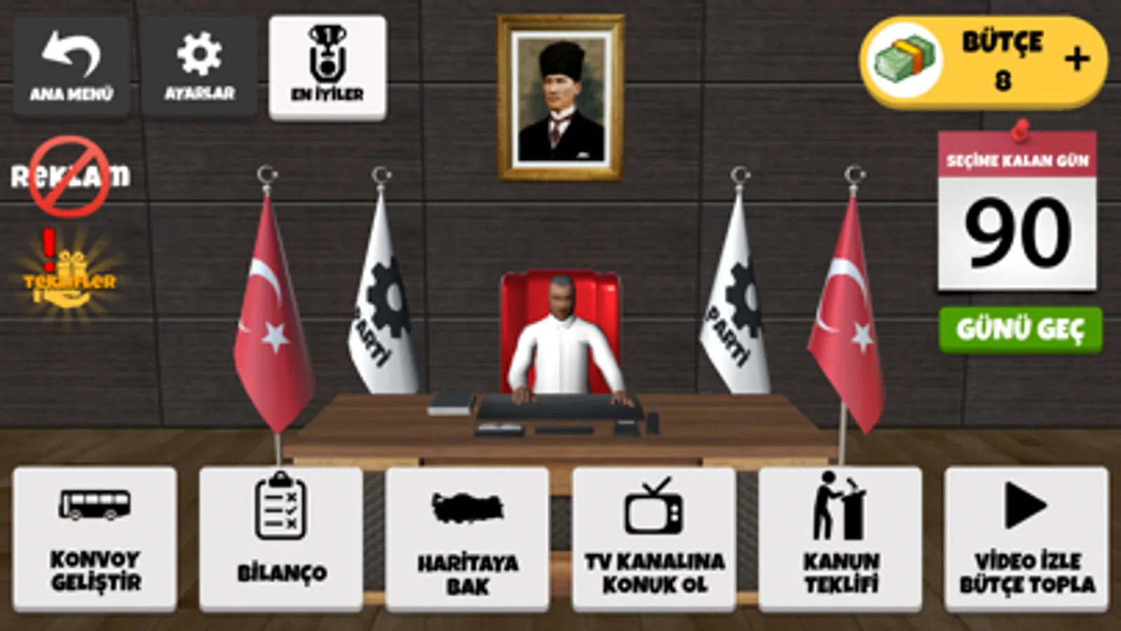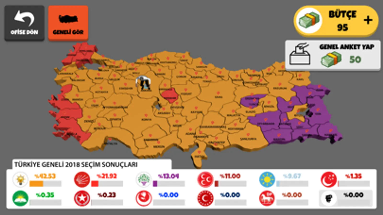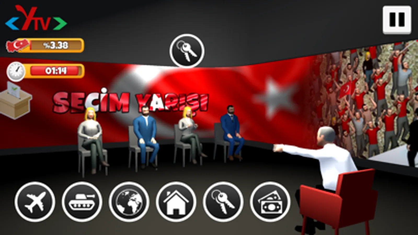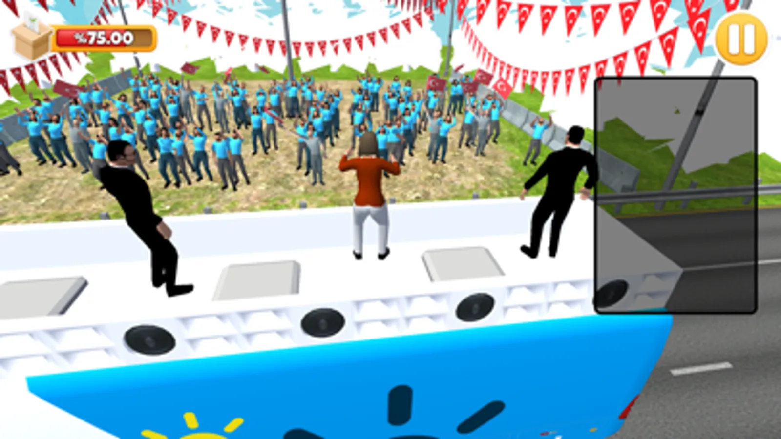 Sevdiğiniz partinin seçim otobüsü ile seçim yolunda arabaları sollayın, yolda rakiplerinize fark atın, miting modunda ve TV programında oyları toplayıp tüm şehirleri kazanın. Dilerseniz kendi partinizi kurun!