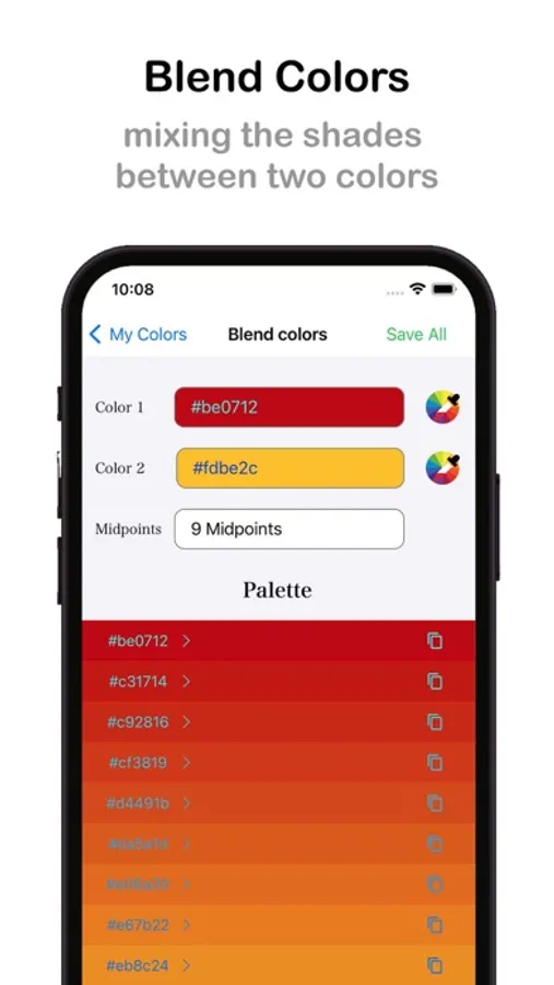 Color Blender generates color scales by mixing the shades between two colors. Generated colors different quantities and see the color that the mixture will result in after blending.