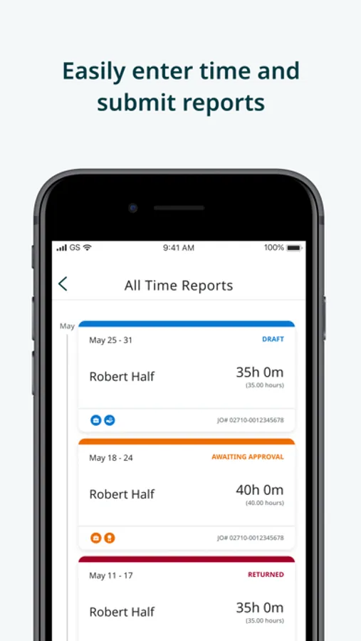 - Easily enter and submit your hours worked and stay informed about the status of your submitted time reports