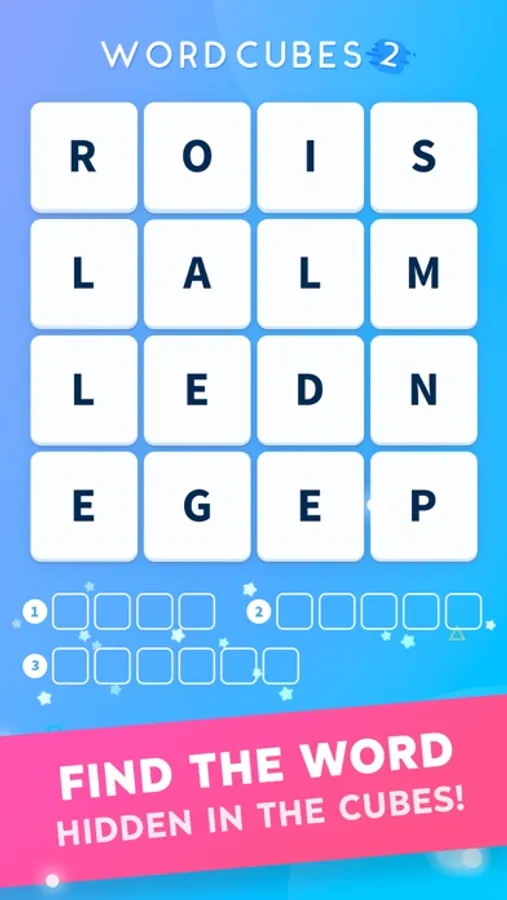Word Cubes 2 - An intriguing game provided for word enthusiasts! We design 59 chapter with 580 levels in 6 grid modes: 2x2, 3x3, 4x4, 5x5, 6x6 and 7x7. Find the hidden words in a grid, and swipe the screen to build them!