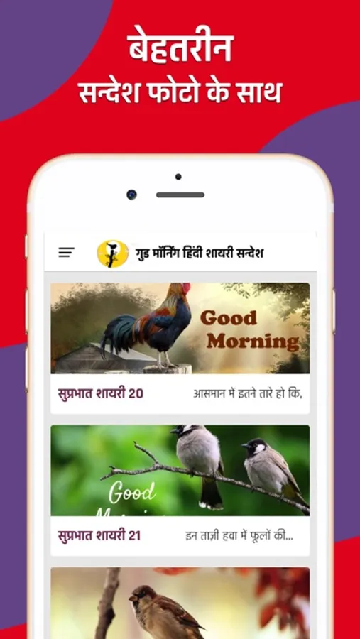 आप इसमें फोटो सहित गुड मॉर्निंग का मैसेज ग्रीटिंग कार्ड के रूप में शेयर कर सकते है तो दोस्तों अभी डाउनलोड करें और शेयर करें गुड मॉर्निंग। हमें आशा है की आपको यह एप्प बहुत पसंद आएगी। आपके सुझाव के लिए हम आभारी होंगे।