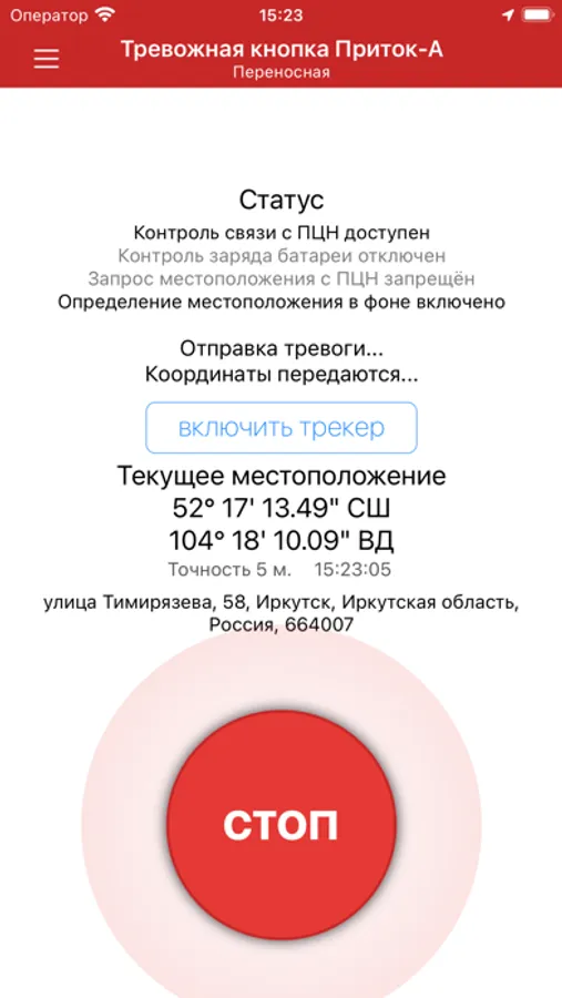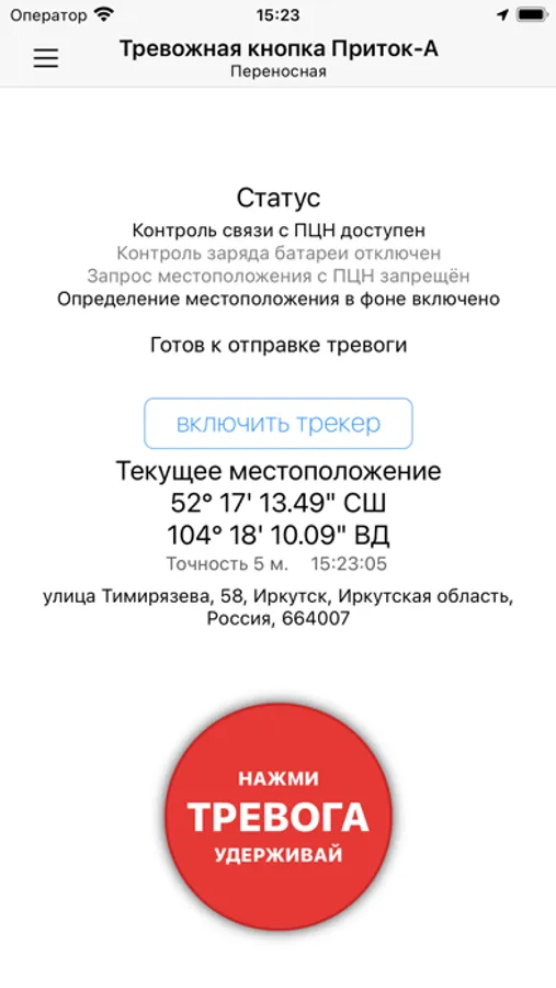 - Нажатие графической тревожной кнопки в интерфейсе приложения;
