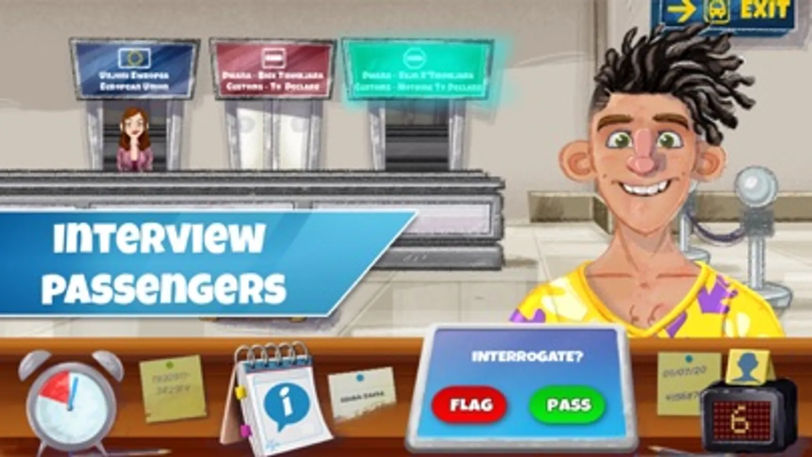 Shared international intelligence will help you identify and interrogate suspicious inbound passengers. Your job is to stop and interrogate passengers whose appearance match those mentioned in the daily intel report, exiting the airport from the wrong doors, carrying pets or who act suspicious during interrogation. Take your time with each passenger, there is no room for mistakes!