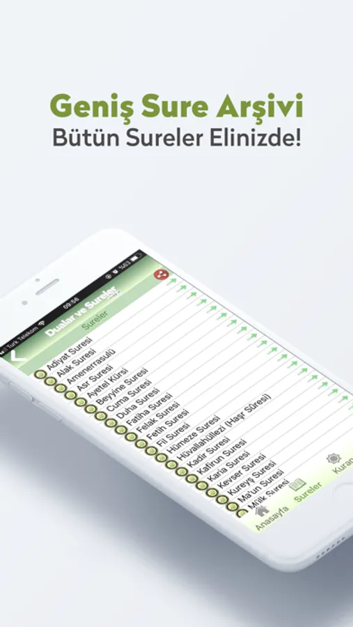 - Kuran-ı Kerim'de geçen Surelerin Arapça, Türkçe ve sesli okunuşları
