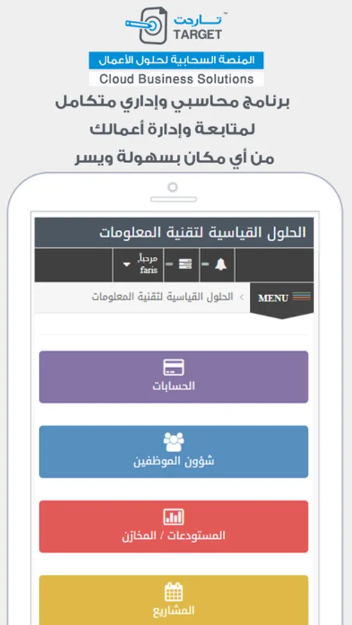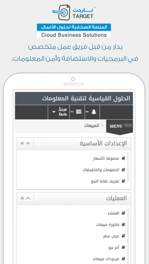 تارجت إي أر بي Target ERP هو المنصة السحابية الأولى لحلول الأعمال للمؤسسات والشركات المتوسطة والصغيرة يحوي على اكثر من خدمة سحابية منها الحسابات والمبيعات والمشتريات والمخزون والموارد البشرية وإدارة المشاريع ، تم تطوير النظام عن طريق شركة الحلول القياسية لتقنية المعلومات ، والمتخصصة في إنتاج وتطوير أنظمة تخطيط الموارد للمؤسسات الحكومية والخاصة. يعمل في الحلول القياسية نخبه من المختصين المتمتعين بأفضل الخبرات العالمية والعملية في مجال تقنية المعلومات.