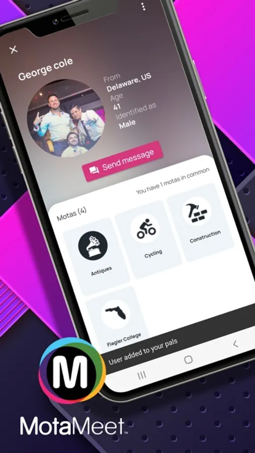 MotaMeet is the easiest way to find new friends and meet new people with the same interests as you! Create your account, add your interests (Motas) and find people with the same interests. Utilize our filters to narrow your audience and find new friends with similar interests. Toggle filters to look for people close to you and with the same interests! Making friends and dating has never been easier.