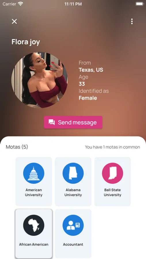 With hundreds of unique Motas and categories, you're sure to find people with the same interests. Love dogs? Play basketball? In a fraternity or sorority? Add them as Motas and you'll find tons of people who are into the same things as you!