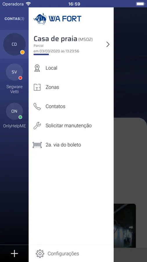 O WA FORT permite que você interaja com o seu painel de alarme diretamente no seu smartphone. Com ele o cliente monitorado pode acompanhar diretamente via celular ou tablet todas as atividades do seu sistema de segurança. Por meio do aplicativo é possível saber o status do painel de alarme, armá-lo e desarmá-lo, visualizar as câmeras ao vivo, verificar eventos e ordens de serviço abertas e realizar chamadas telefônicas para contatos cadastrados no seu perfil. É a segurança que você precisa na palma da sua mão.