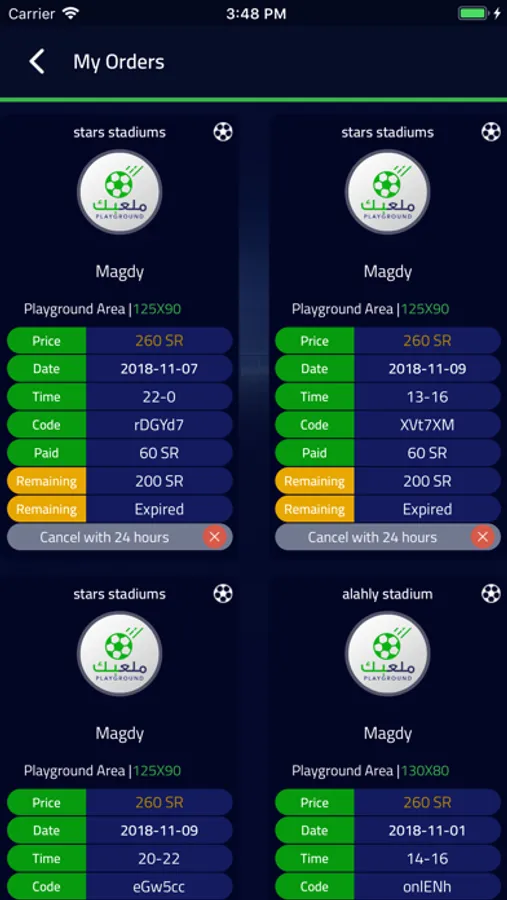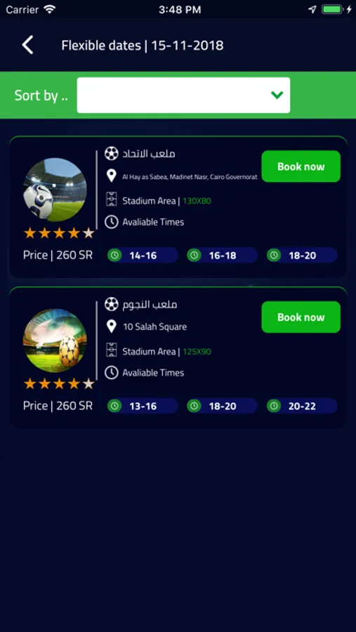 تطبيق ملعبك هو تطبيق لكل من يريد أن يحجز ملعباً و يسهل عليك التطبيق ان تحجز الملعب بالبحث بالمدينة واليوم ، و يوفر التطبيق لك كل المعلومات التي تريدها عن المعلب المساحه و العنوان والتقيم والسعر كما يوفر لك التطبيق الدفع عن طريق كارت الائتمان و يعطيك بعض الخصومات عند الحجز و يضمن لك التطبيق الخدمة الممتازة فعندما تواجهك اية مشكلة يمكنك تقديم شكوى وسوف يتم الرد عليك وحل المشكلة