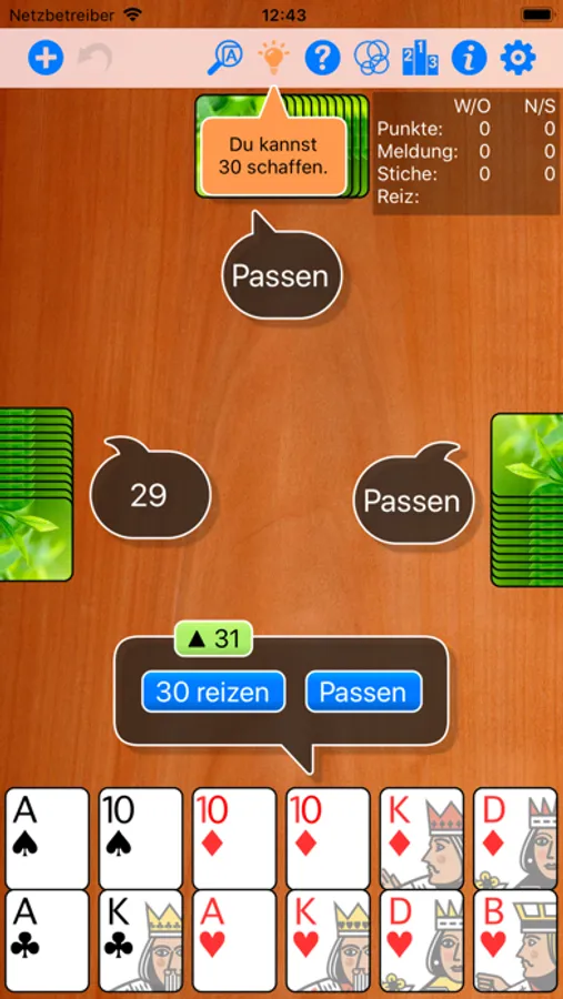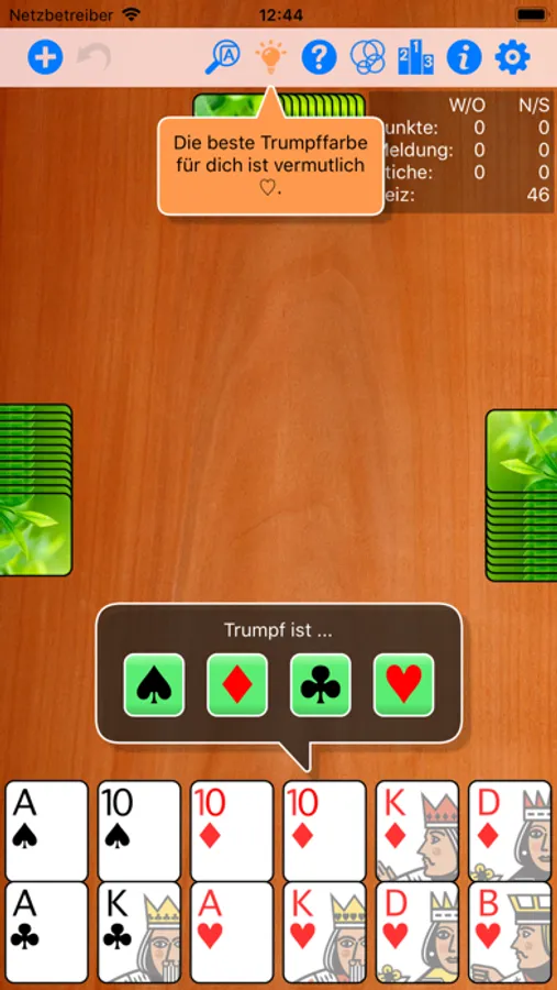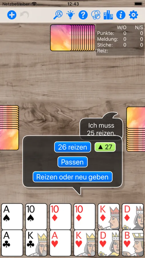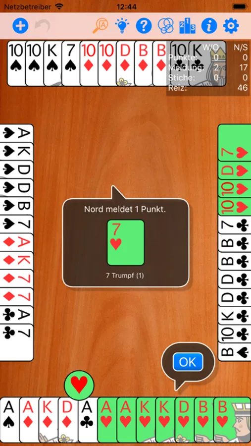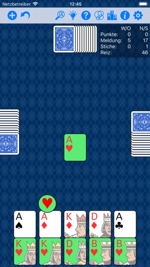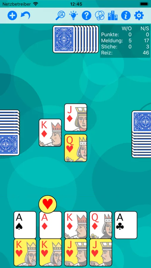 Voll funktionsfähige, werbe-unterstütze Binokel-App für iPhone und iPad. Spielen Sie mit einem Einzel- oder Doppel-Deck mit konfigurierbaren Optionen. Binokel wird häufig aktualisiert mit von Nutzern vorgeschlagenen Funktionen und AI-Verbesserungen.
