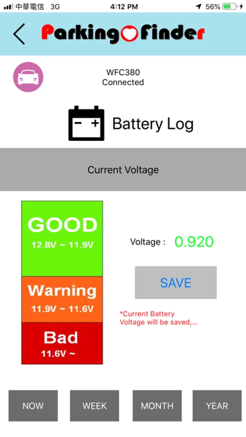 Car/Bike Parking Finder can log Car Battery voltage by using product 'WFC380'.