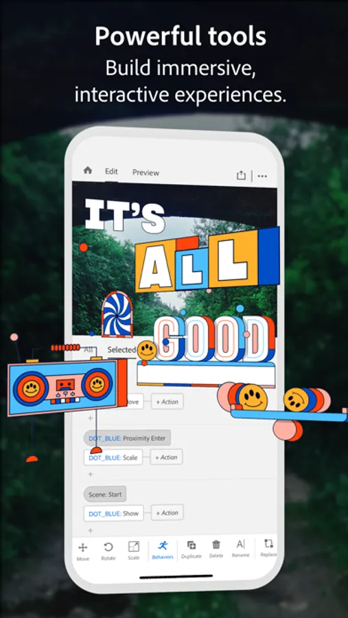 With Aero, you can create interactive experiences without needing to rely on a developer. Apply behaviors to your content to build combinations of triggers and actions that draw viewers of your experience to drive the narrative and engage with the story. Add motion to your objects by using your mobile device to draw the path of motion you want the object to take.