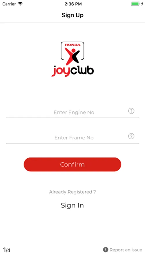 1. You will sign-up to the app using your Honda 2 Wheeler Engine and Frame Number.