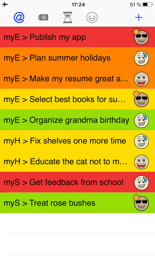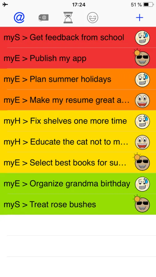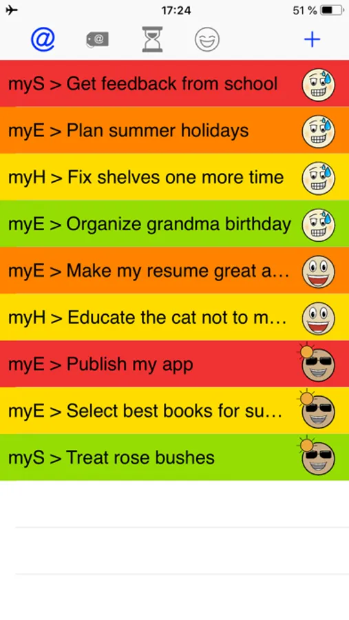 With a simple 3 levels smile-framework of criticality (cool, important, critical) and an automatic coding color deadline, you will manage simply all your todos.