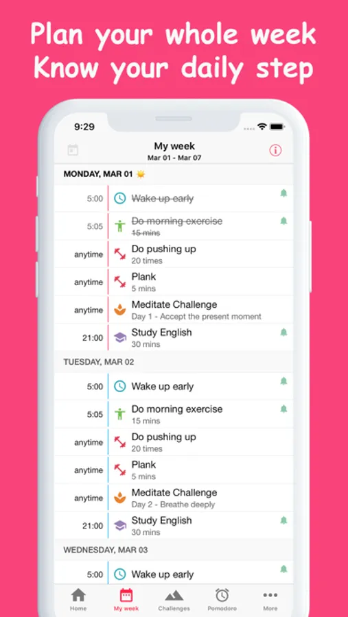 WeekPlan is made to help you build a healthy routine of life-changing habits. Set personal goals, track your progress, and motivate yourself to get a better you!