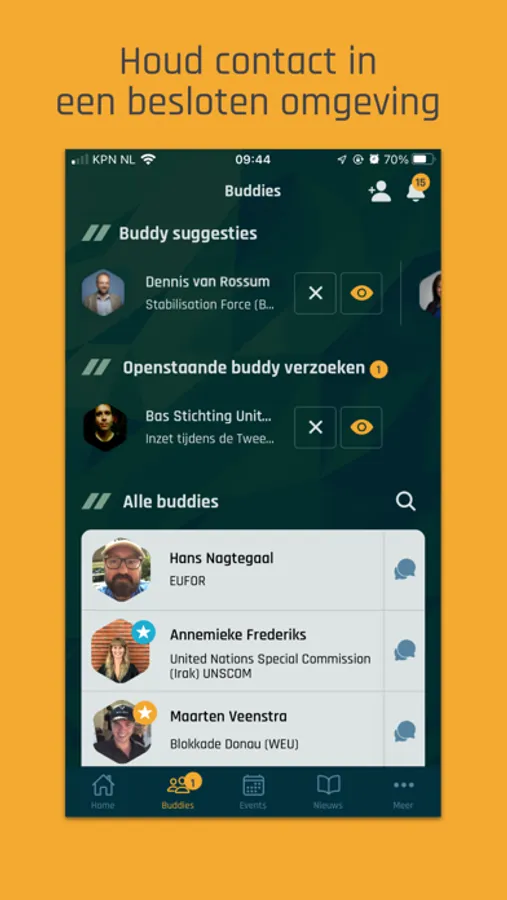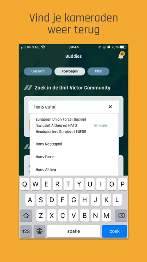 VERBINDING: Houd contact met oud-collega’s en vind kameraden terug die je uit het oog bent verloren. Je kunt anderen zoeken op naam, missie, jaartal, krijgsmachtonderdeel of bijnaam.