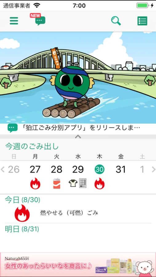 収集日変更のお知らせやイベント情報などを確認することができます。