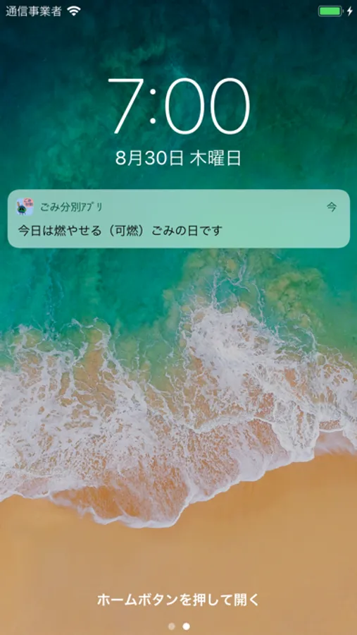 収集予定のごみ種別を前日と当日にアラートでお知らせします。時間は自由に設定することができます。