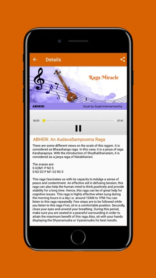 The term Raga Miracle means wonder through Raga. Ragas create positive vibrations that can be used to cure ailments in people. This app provides you with a list of ragas that can help you heal your ailments. Many musicians and scholars have conducted research on healing ragas and I pursued the research by understanding the profundity of each healing Raga. An article on the topic "Raga lakshanam" is what lead me to pursue this idea in the first place. Each Raga has its own authenticity, and this authenticity is the purpose behind healing ragas.