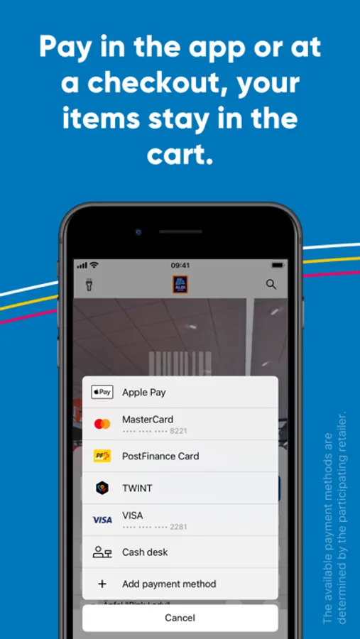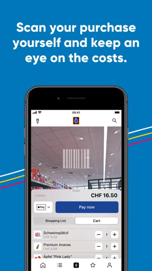 Visit a participating store and hold the barcode of products you want to buy into the camera. Simply do it while shopping. All products end up in a shopping cart in the app - now just pay and leave the store. Without standing in the checkout line and without putting the items on the belt.