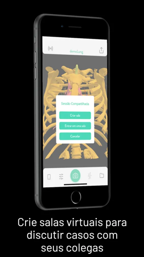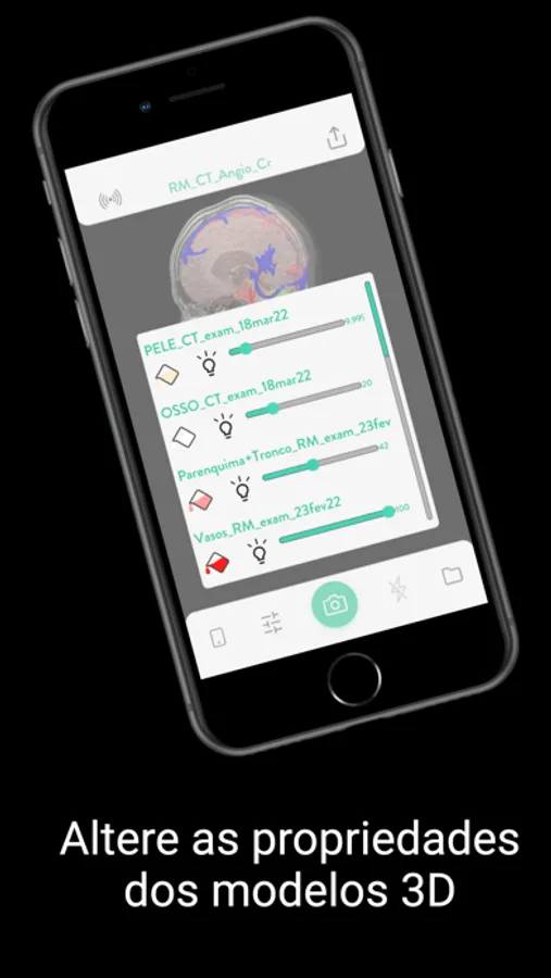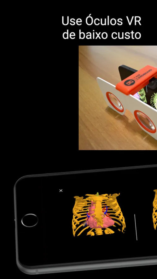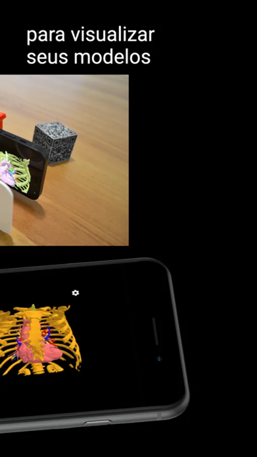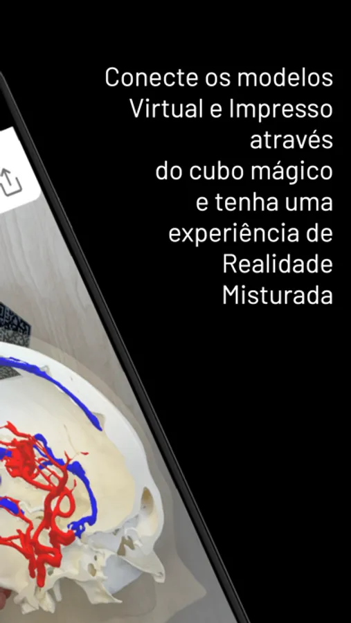 No modo de Realidade Virtual, o aplicativo permite girar, aproximar e deslocar os modelos 3D de seus exames. Quando no modo de Realidade Aumenta, combina os modelos 3D com o ambiente real ou até mesmo com biomodelos impressos.