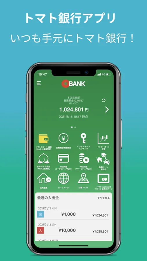 スマホで簡単!インターネットバンキングの契約がなくてもOK!いつでもどこでも残高照会や入出金明細を確認できる、トマト銀行アプリ!