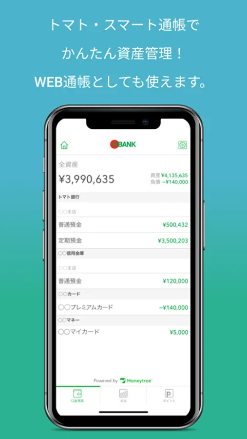 ・「トマト・スマート通帳(かんたん資産管理)」はマネーツリー株式会社が提供するサービスです。当該サービス利用規約に同意の上でご利用ください。なお、正確な残高や入出金明細等については、インターネットバンキング等、トマト銀行が提供するサービスでご確認ください。