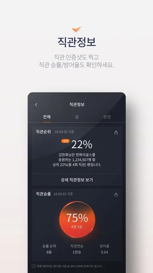 가중치 승률이 반영된 직관 승요 TOP30 랭킹 확인 및 직관 경기 한 줄 리뷰 기능으로 한화이글스 경기의 짜릿한 경험을 함께 공유하실 수 있습니다.