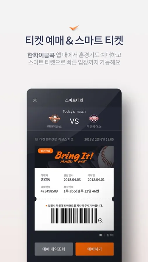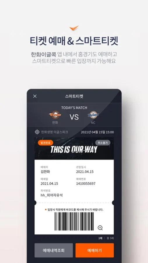 한화이글콕 앱 안에서 홈경기 예매는 물론 여러 장의 티켓을 예매하여 지인에게 선물할 수 있습니다.
